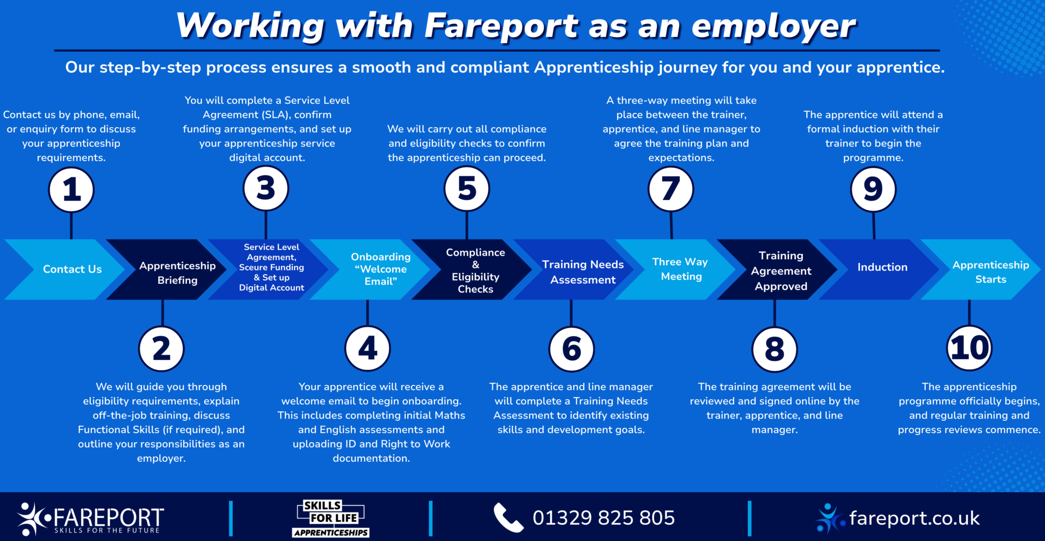 Find out how you can start working with Fareport as an employer. We will discss the steps you take, from en quiry, to your learner starting their Apprenticeship with Fareport.