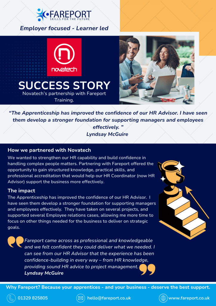 The Apprenticeship has been invaluable in building both technical HR knowledge and the confidence to apply it in real business situations. Fareport’s support has been professional, encouraging.